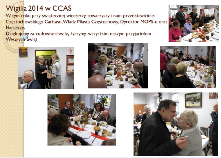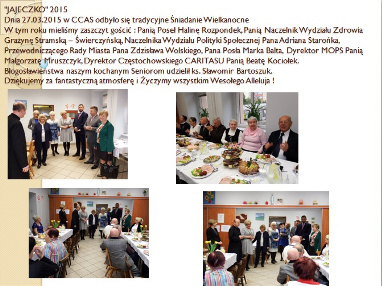 10-go Kwietnia w CCAS zorganizowane zostało uroczyste Śniadanie Wielkanocne. Błogosławieństwa udzielił ks. Sławomir Bartoszuk. Goślił u nas Prezydent Krzysztof Matjaszczyk, Przewodniczący Rady Miasta Pan Zdzisław Wolski , Adrian Staroniek – Naczelnik Wydziału Promocji Zatrudnienia i Spraw Społecznych, a także, Zastępca dyrektora MOPS-u Pani Małgorzata Mruszczyk oraz przedstawiciele częstochowskiego Caritasu.